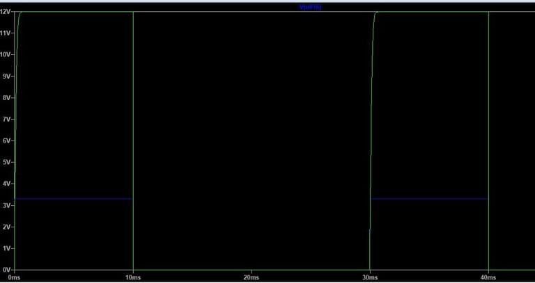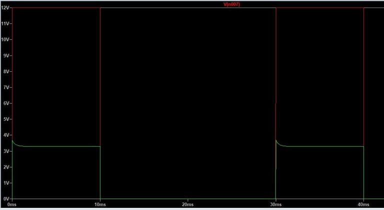 12V 100KHz pulse being shifted down to 3.3 has a small overshoot that hits 3.5V. 3.3V 100KHz pulse being shifted up is damped due to the rise time and reaches 12V at the rise time.